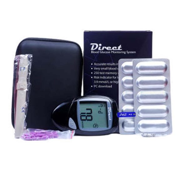 This glucose monitoring machine shows accurate results in 6 seconds. It requires a very small blood sample, only 0.7 uL. Excellent 250 test memory with date and time. Direct glucose machine also has a risk indicator for lower than 3.9 mmol/L or higher than 10.0 mmol/L.